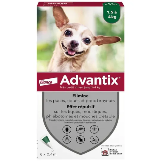Advantix très petit chien jusqu'à 4kg 6 pipettes aide à lutter contre les principaux parasites externes qui infestent les chiens et lui transmettent des maladies qui peuvent s'avérer être mortelles.Ainsi, Advantix intervient en prévention et traitement des infestations par les puces (cténocephalides felis, cténocephalides canis) et les tiques (Rhipicephalus sanguineus, ixodes ricinus) pendant 4 semaines, et 3 semaines pour les tiques (dermancentor reticulatus). Les puces présentes sur le chien sont tuées dans les 24 heures qui suivent le traitement et Advantix peut être intégré dans le traitement de la Dermatite Allergique par piqûres de puces. Quant aux tiques déjà présentes sur le chien, elles peuvent ne pas être tuées dans les 48 heures suivant le traitement, il donc conseillé de les enlever avent de procéder à l'administration de l'Advantix.Une seule administration d'Advantix assure une action répulsive sur les phlébotomes et les moustiques pendant deux à trois semaines et quatre semaines contre les mouches d'étable.Contre indication : Il ne doit pas être utilisé sur le chat, ni sur le chiot de moins de 7 semaines et pesant moins de 1,5kg.Conseils d'administration :Sortir une pipette de l'emballage, la tenir en position verticale, tourner et tirer le capuchon. Retournez ensuite le capuchon et le visser pour perforer l'orifice de la pipette. Écartez les poils du cou du chien, à la base du crâne, jusqu'à atteindre la peau, puis vider le contenu de la pipette par de fortes pressions sur celle-ci. Il ne faut pas laisser le chien entre en contact avec le milieu aquatique au moins 48 heures après le traitementMise en garde : Ne pas faire avaler ou administrer par voie parentérale. Evitez que le chien traité ou les autres chiens de la maison ne lèchent le site d'application tant qu'il est humide.Informations additionnelles : Les puces sont souvent infectées par les larves des vers plats, qui peuvent être avalées par votre chien lorsqu'il fait sa toilette. Par conséquent, afin de contrôler les vers, il faut également contrôler les puces.