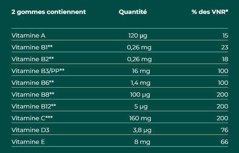 - Un complexe vitaminique B (B3, B6, B8, B12) qui couvre au moins 100 % des valeurs nutritionnelles de références (VNR) avec 2 gommes