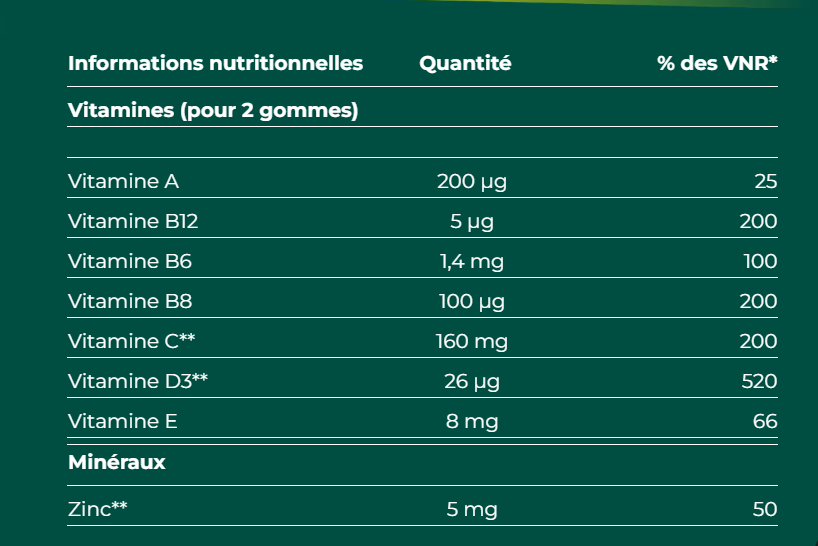 - Riche en vitamines C, D et zinc