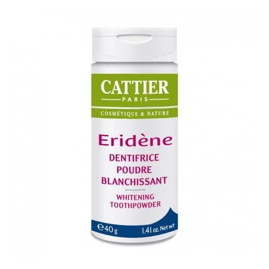 La Poudre Blanchissante Cattier Eridène, agit sans rayer l'émail. Elle est active contre les tâches, la plaque dentaire et blanchit les dents.