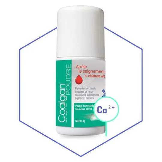 Coalgan Arrête le Saignement Poudre 8 g est une poudre hémostatique bio-active stérile qui arrête le saignement et est idéale en cas de plaies sur le cuir chevelu, coupures de rasoir, écorchures, égratignures, érythèmes fessiers.- Elle arrête le saignement rapidement : l'alginate de calcium favorise l'agrégation des plaquettes et diminue le temps de coagulation.- Elle favorise la cicatrisation : l'alginate de calcium stimule les cellules clés de la cicatrisation, activant ainsi les défenses contre les micro-organismes et les bactéries. Les risques de complication dermatologiques sont ainsi réduits. Son petit format est pratique et permet de l'emporter dans un sac lors des vacances, par exemple.Pour toute la famille : les produits de la gamme COALGAN s’adressent à tous y compris les femmes enceintes, les enfants et les personnes âgées. Aucune contre-indication