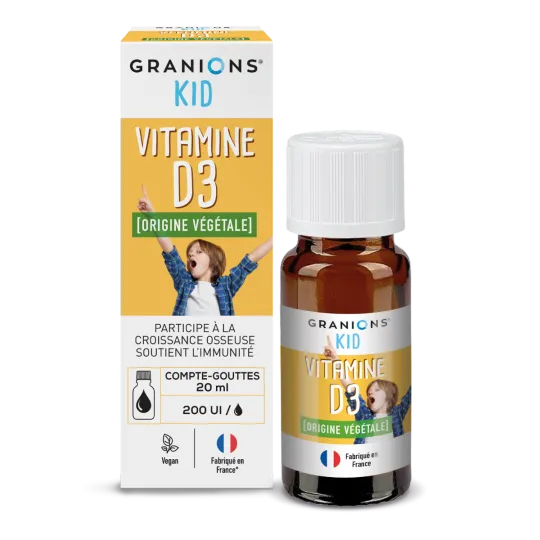 Granions Kid Vitamine D3 20ml est un complément alimentaire à base de vitamine D3 d’origine végétale issue du Lichen, l’association d’un champignon et d’une algue qui pousse sur les rochers et les arbres.