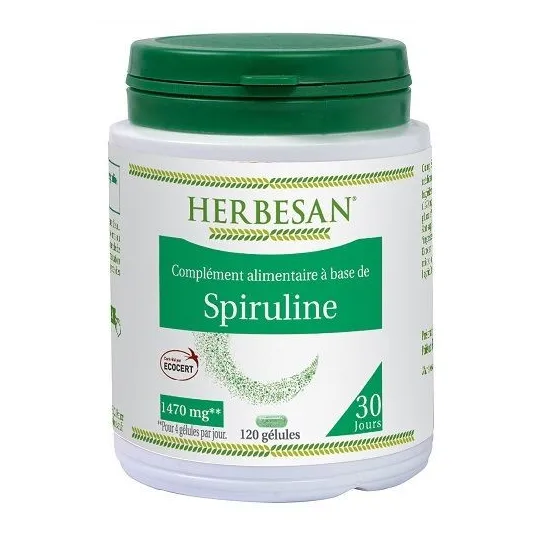 Chaque jour, Herbesan Spiruline vous apportera 1470 mg de spiruline dont 0,846 g (quantité moyenne) de protéines pour 4 gélules.