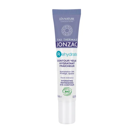 Enrichi en eau thermale de Jonzac, glycérine végétale et acide hyaluronique d'origine naturelle, le Contour des Yeux hydratant Fraîcheur Rehydrate hydrate(1) intensément jusqu'à 24h, apaise et protège durablement la zone sensible et délicate du contour des yeux pour un regard frais tout au long de la journée.