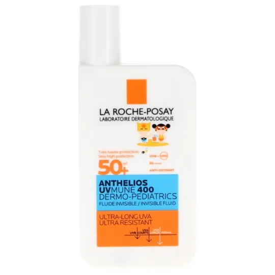 Le fluide solaire peau sensible Anthelios UVMUNE 400, à l'eau thermale de La Roche-Posay, est un soin pédiatrique SPF50+ ;