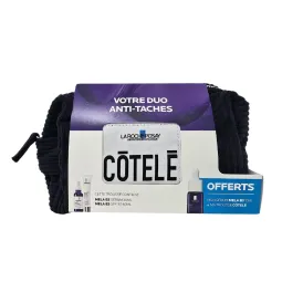 Cette trousse en velours côtelé renferme un sérum Mela B3 et un soin correcteur Mela B3 SPF 30.