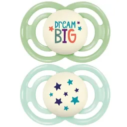 Une sucettes à la forme aérée qui laisse respirer la peau de bébé et réduit le risque de mauvais alignement des dents. Elles sont phosphorescentes et brille dans la nuit.
