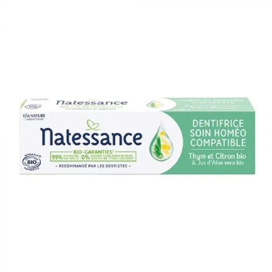 Le Dentifrice Soin Homéo-compatible, enrichi en Aloe vera bio aux propriétés apaisantes et en Citron et Thym bio, aux propriétés assainissantes, a été conçu pour apporter une hygiène buccale quotidienne, sans risque avec la prise d'un traitement homéopathique.