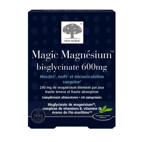 Ce complément alimentaire contient 60 comprimés de Magic Magnésium bisglycinate 600mg de New Nordic.