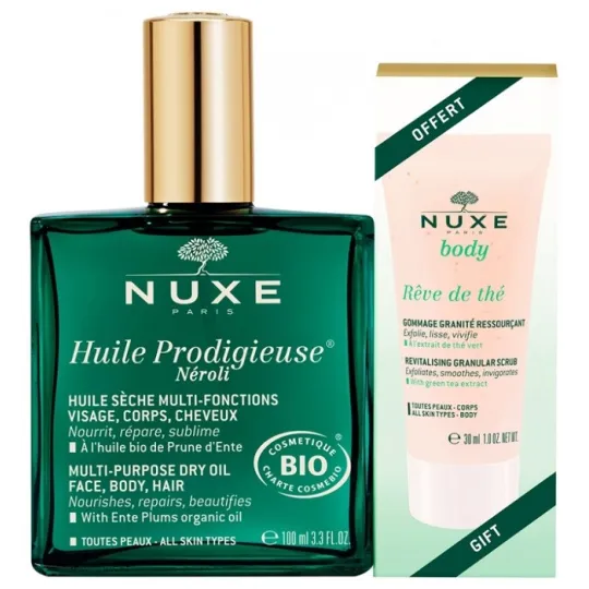 Nuxe Bio Huile Prodigieuse Néroli Vegan 100ml+ Nuxe Body Rêve de Thé Gommage 30ml OFFERT