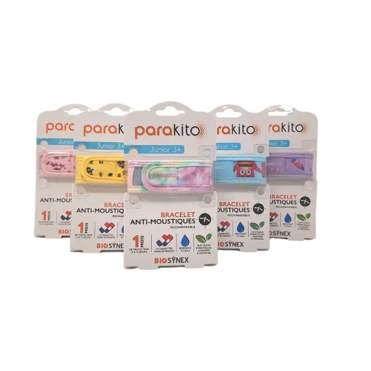 Le bracelet anti-moustiques aux huiles essentielles Parakito est un produit très efficace pour éloigner les moustiques. Il s'agit d'un bracelet en néoprène, disponible en plusieurs couleurs et motifs, qui est imprégné d'une solution à base d'huiles essentielles de citronnelle, de lavande et de géranium.