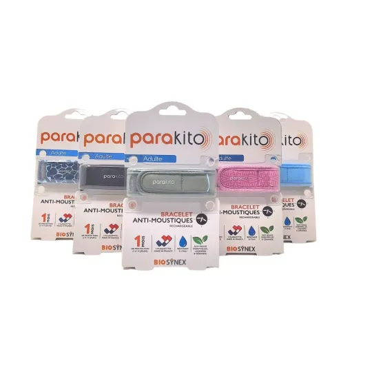 Le bracelet anti-moustiques aux huiles essentielles Parakito est un produit très efficace pour éloigner les moustiques. Il s'agit d'un bracelet en néoprène, disponible en plusieurs couleurs et motifs, qui est imprégné d'une solution à base d'huiles essentielles de citronnelle, de lavande et de géranium.