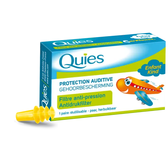 Les protections auriculaires anti-pression de Quies sont indispensables aux oreilles sensibles pour tout voyage en avion ou en train ou pour l'altitude. Dans certains cas (atterrissage, traversée de tunnel à grande vitesse), la variation brutale de pression sur le tympan peut entraîner une douleur très vive.