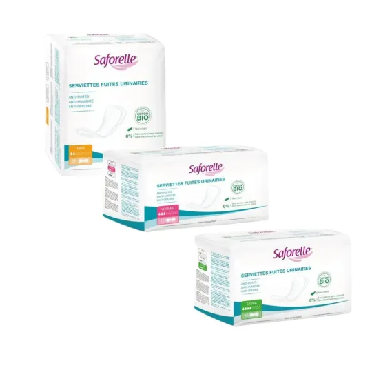 La taille est à choisir en fonction de vos besoins. Les Serviettes Fuites Urinaires Saforelle existent en 3 tailles : Mini, Normal ou Extra