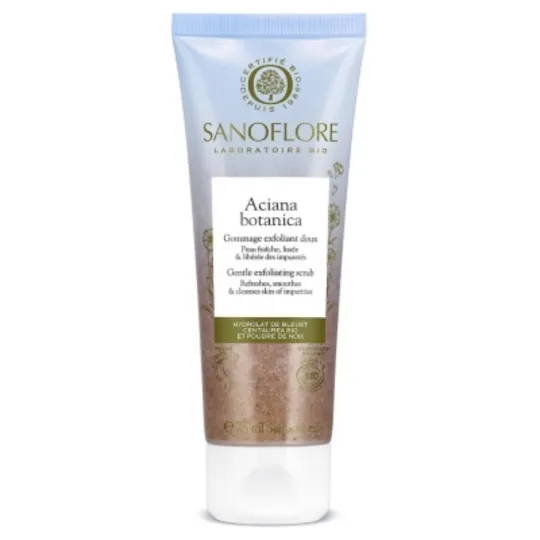 Sanoflore Aciana Botanica 75ml démaquillant exfoliant quotidien doux, naturel et certifié Bio . Il démaquille, nettoie en profondeur et élimine les particules de pollution présentes sur votre peau. Formulé à base d'hydrolat de Bleuet Centaurea Bio dépolluant, et de poudre de Noix exfoliante, il lisse votre peau et en élimine les cellules mortes et tout en réveillant son éclat.
