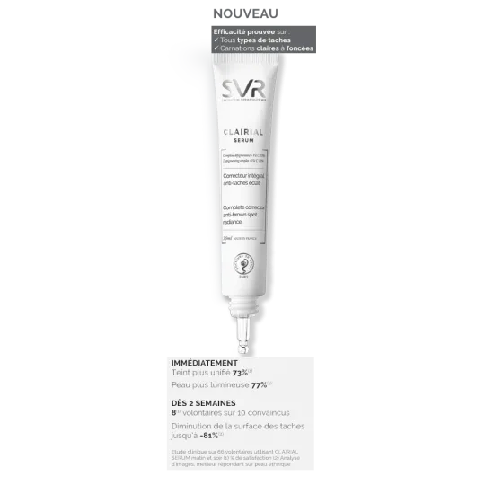 SVR perce le secret de la blancheur des paumes de mains. Pour la 1ère fois**, CLAIRIAL SERUM reproduit ce mécanisme pour corriger : Tous les types de taches : taches de soleil, de vieillesse, masque de grossesse, marques d’imperfections. Toutes les carnations : claires, mates, foncées.