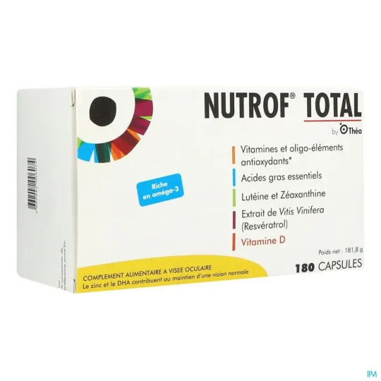 Théa Nutrof Total contient une association d'ingrédients spécifiques. La formule* NUTROF® TOTAL combine le zinc avec plusieurs substances vitales pour préserver une vision normale, le fonctionnement normal du système musculo-squelettique et du système immunitaire.