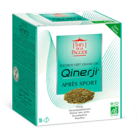 Qinerji bio après sport 18 sachets, contient du Rooibos vert grand cru, de la Prêle, de l'Harpagophytum, de la Reine-Des-Prés, de l'eucalyptus et de la Menthe. Pour la récupération aprés l'effort sportif.