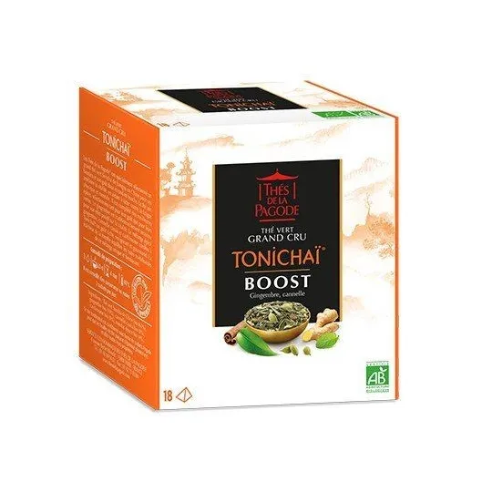 Tonichaï ® est un thé épicé qui vous procurera un effet "boost" grâce au vertus combinées du thé vert Sencha, du gingembre, de la cannelle et de la cardamome tout en vous offrant un goût aux notes gourmandes et un parfum à la fois doux, envoûtant, vif et frais.
