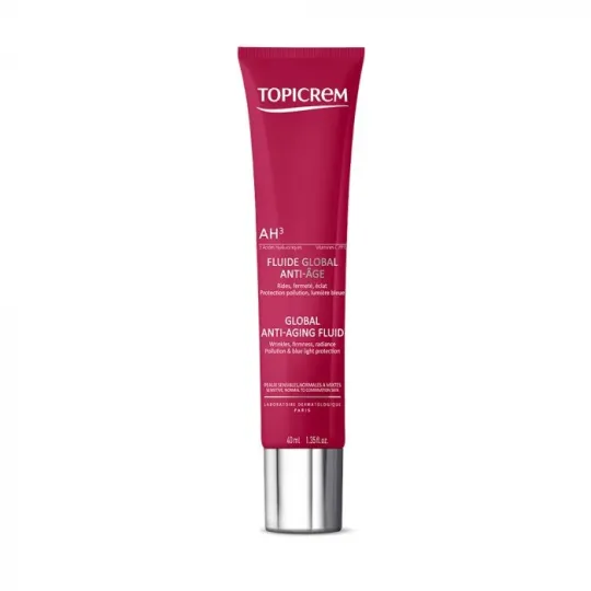 Topicrem AH3 Fluide Global Anti-âge, à la texture légère, corrige les rides, redensifie la peau et uniformise le teint grâce à l'alliance de 3 Acides Hyaluroniques, de Vitamines C&E stabilisées, de Vitamine PP et d'un Dipeptide.