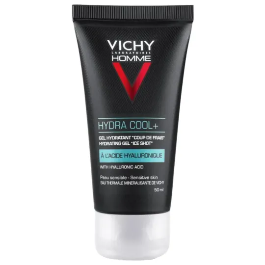 Le gel frais et fondant Hydra Cool+ de Vichy Homme procure une hydratation durable jusqu'à 48 heures grâce à son actif phare, l'acide hyaluronique.