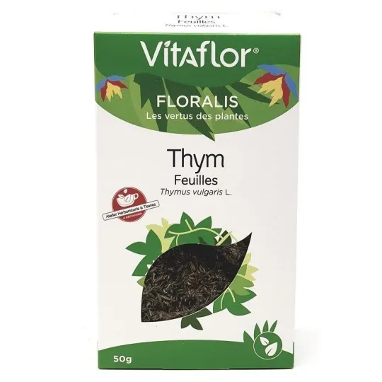 Vitaflor Feuille de Thym 50g convient pour contribuer à améliorer la digestion (en cas de fermentation intestinale, de douleurs et spasmes de l'estomac...)